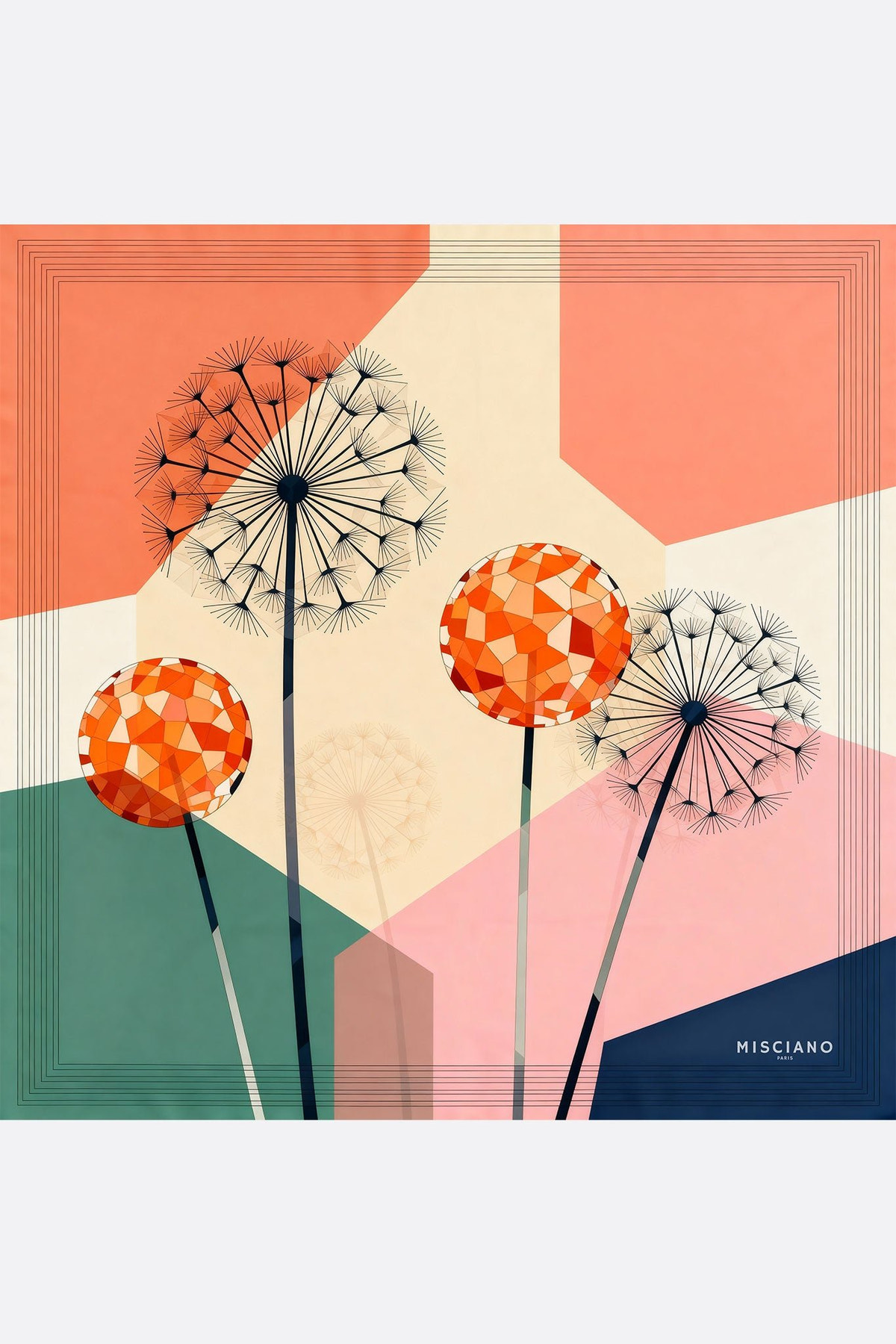 The silk square Geometric Fragrance 90 reveals a luminous composition where the delicacy of dandelions meets the warm presence of faceted spheres. The graphic structure of the background, composed of coral, cream, deep green, and midnight blue flats, offers a soft architecture that highlights the lightness of the floral pattern. This Misciano creation evokes a summer breeze crossing a stylized, vibrant, and delicate landscape.