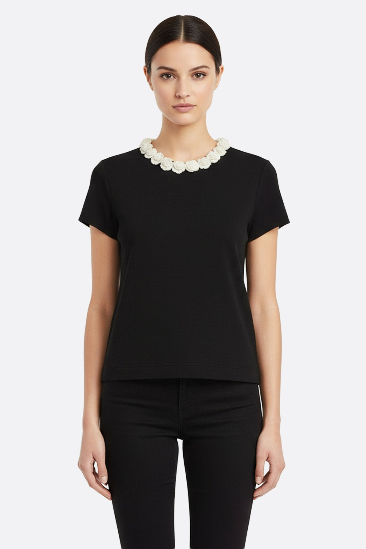La camiseta negra Misciano se distingue por la elegancia de su línea depurada y la delicadeza de su cuello adornado con camelias blancas perladas. Este contraste refinado entre la profundidad del negro y la luminosidad de las flores nacaradas confiere a la pieza un carácter único, a la vez sobrio y espectacular.
