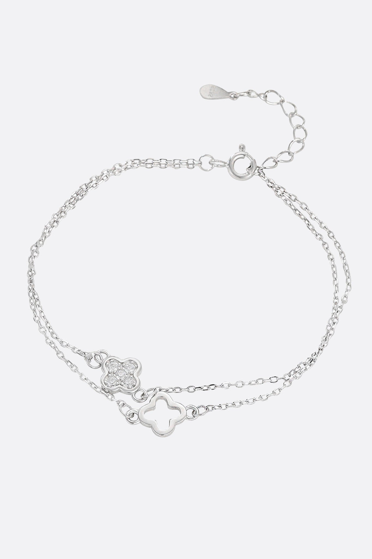 Esta pulsera de plata fina seduce por la ligereza de sus líneas y la sutil armonía de sus dos cadenas. En el centro, dos motivos de tréboles se responden: uno calado para un toque aéreo, el otro engastado con zirconias centelleantes para captar la luz con finura. Este contraste de materiales crea un juego visual elegante y refinado, perfecto para realzar tus atuendos diarios como tus looks de noche.