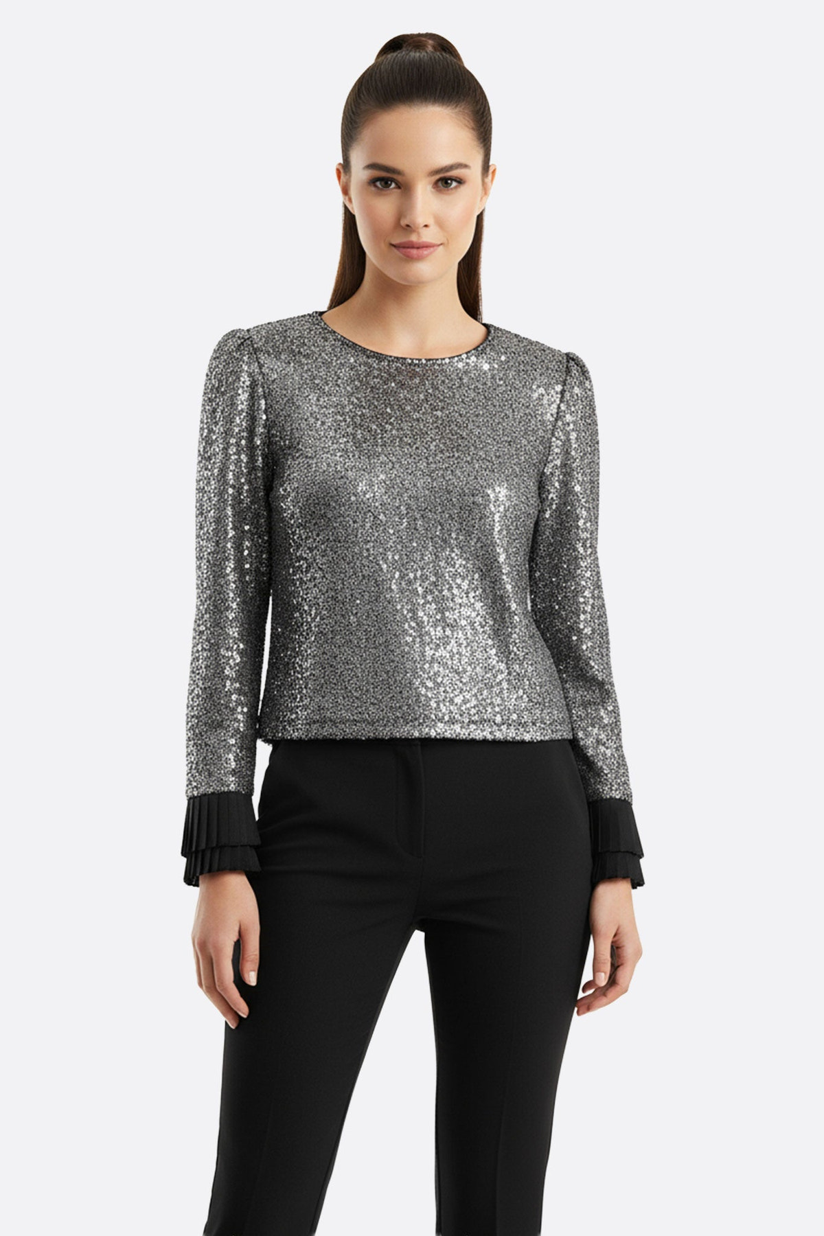 Top de noche plateado, top con lentejuelas para mujer, top corto de mangas largas, cuello redondo elegante, top brillante de cóctel, top plateado negro, pieza luminosa Misciano.