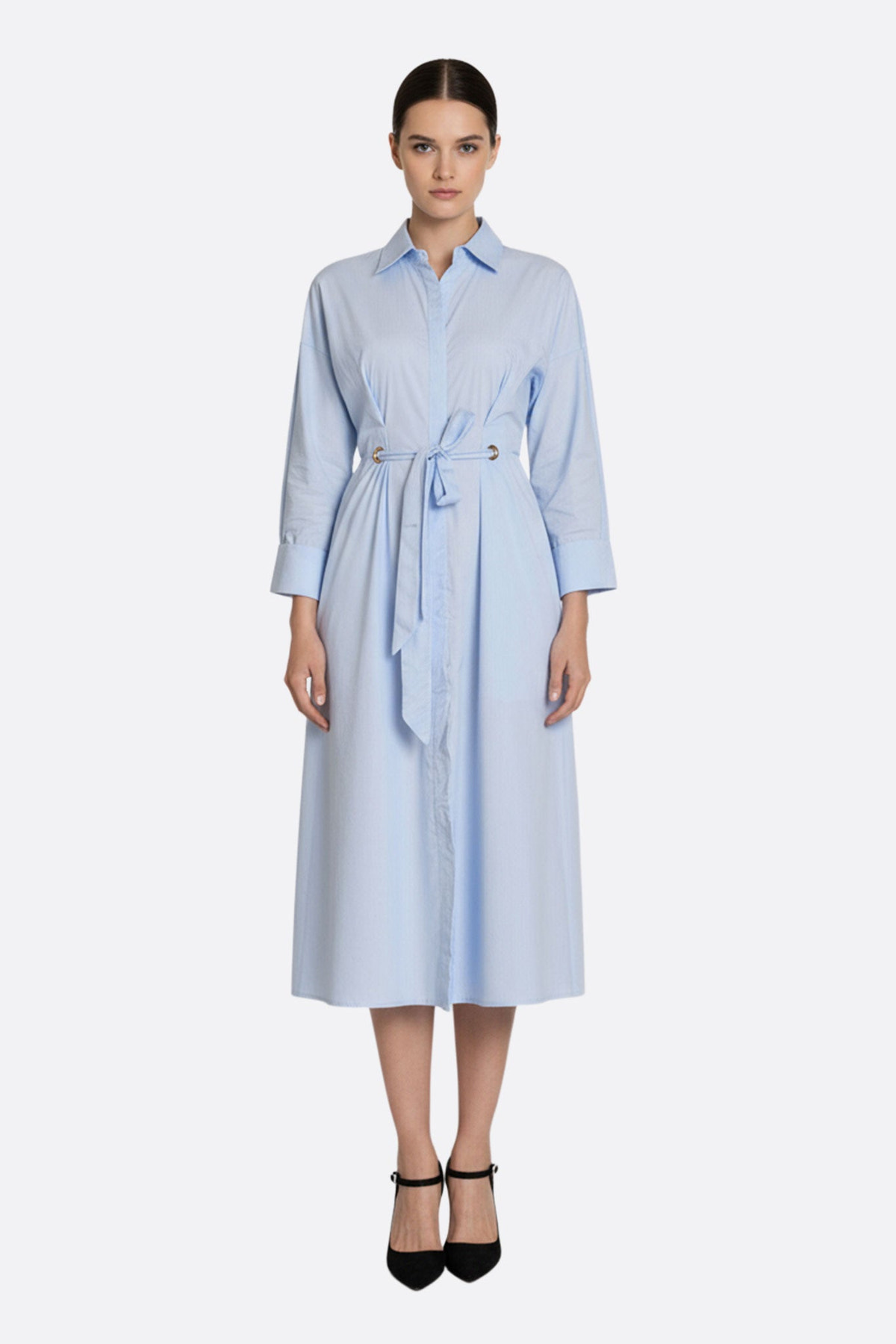 Versatile e raffinata, questa robe chemise blu cielo è un pezzo imprescindibile del guardaroba femminile. Si adatta a tutte le occasioni: lavoro, uscite o eventi eleganti, valorizzando la femminilità contemporanea.