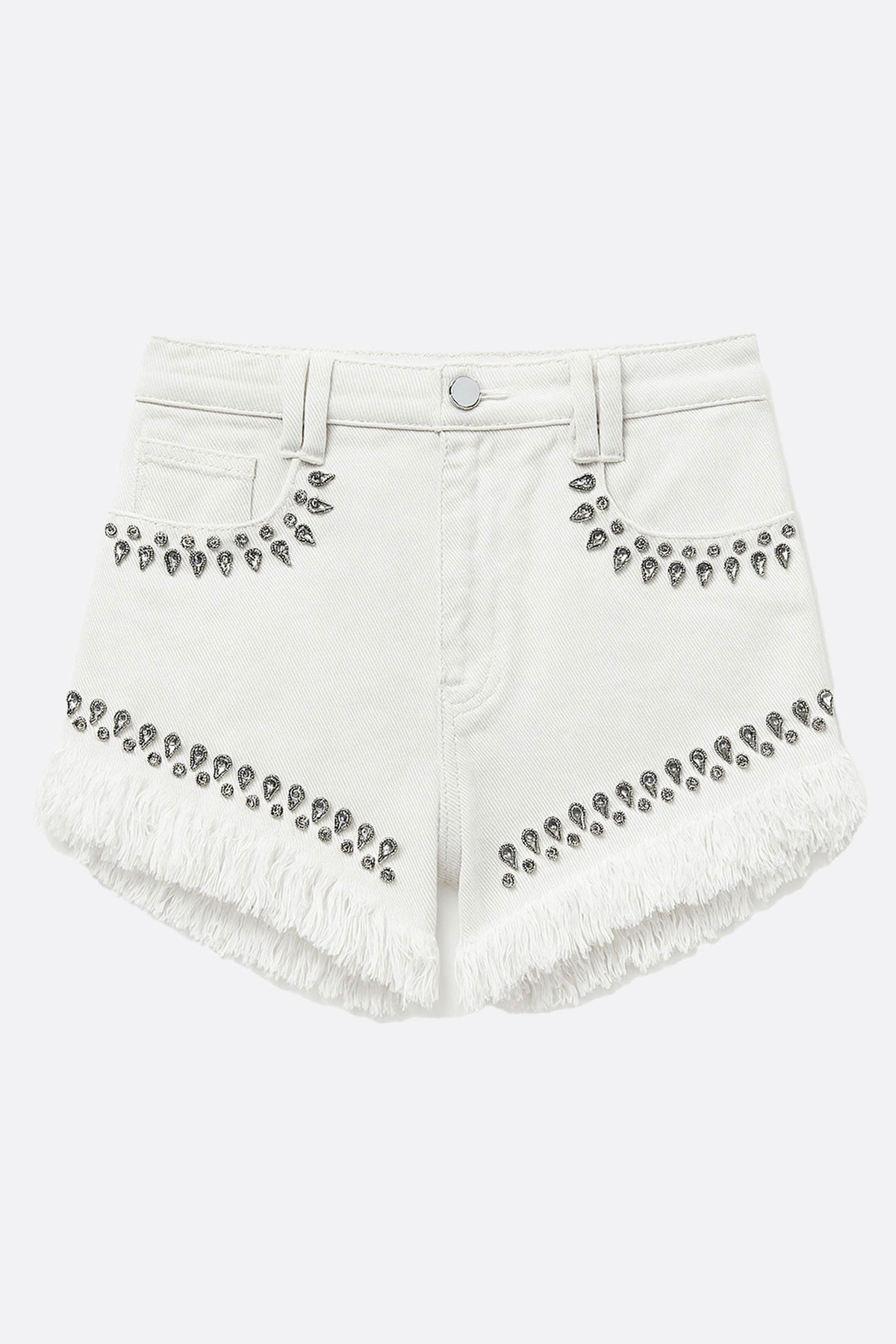 Эти белые джинсовые шорты, подчеркнутые деликатными бахромами и украшенные созвездием серебристых страз в форме капель, являются предметом, который освещает силуэт. Одновременно смелые и утонченные, они воплощают идеальный баланс между богемным духом и современной элегантностью. Их продуманный дизайн привлекает взгляд, не перегружая образ.