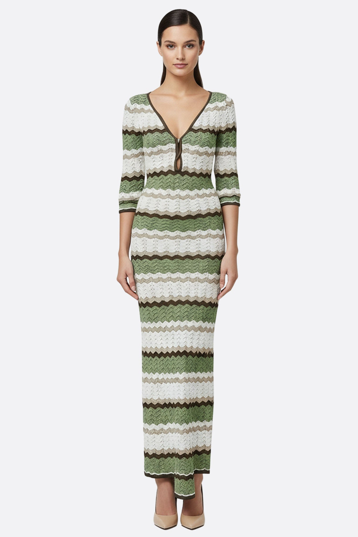Сублимная и воздушная, это длинное платье крючком празднует естественную элегантность и изысканное ремесло. Вязано в знаковом волнистом узоре, оно чередует оттенки шалфейного зеленого, слоновой кости и шоколадно-коричневого, вызывая нежность средиземноморского заката. Его облегающий силуэт нежно обнимает формы, не сковывая движения, создавая стройный и женственный образ.