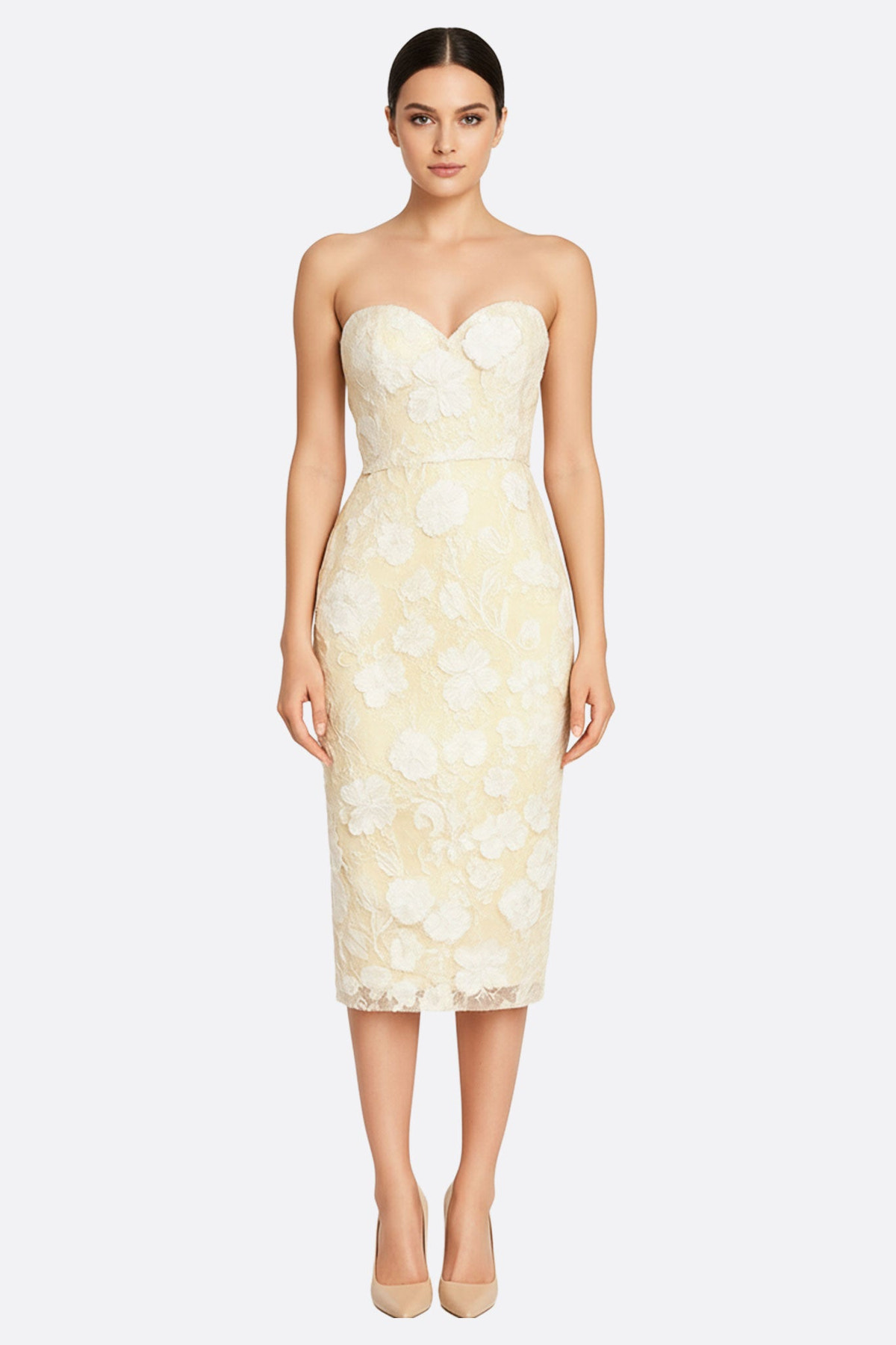 Это миди-платье с корсетом из прозрачного вышитого тюля олицетворяет sensuality и вечную элегантность дома Misciano. Его облегающая силуэт точно подчеркивает изгибы, в то время как вышитые белые цветочные узоры, нанесенные вручную, вызывают образ поэтического и утонченного сада.