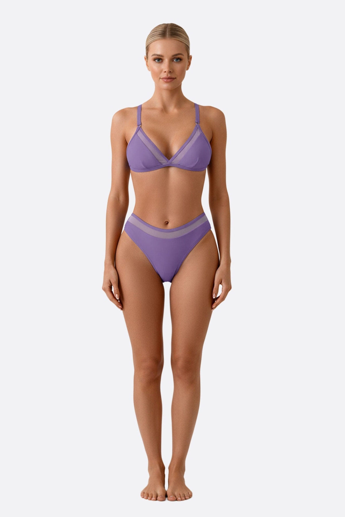 Продемонстрируйте шикарный и женственный образ с этим двухсекционным бикини смелого и элегантного фиолетового цвета. Изготовленный из мягкой и комфортной ткани, он выделяется прозрачными сетчатыми вставками, которые придают легкий оттенок чувственности, оставаясь при этом утонченным.