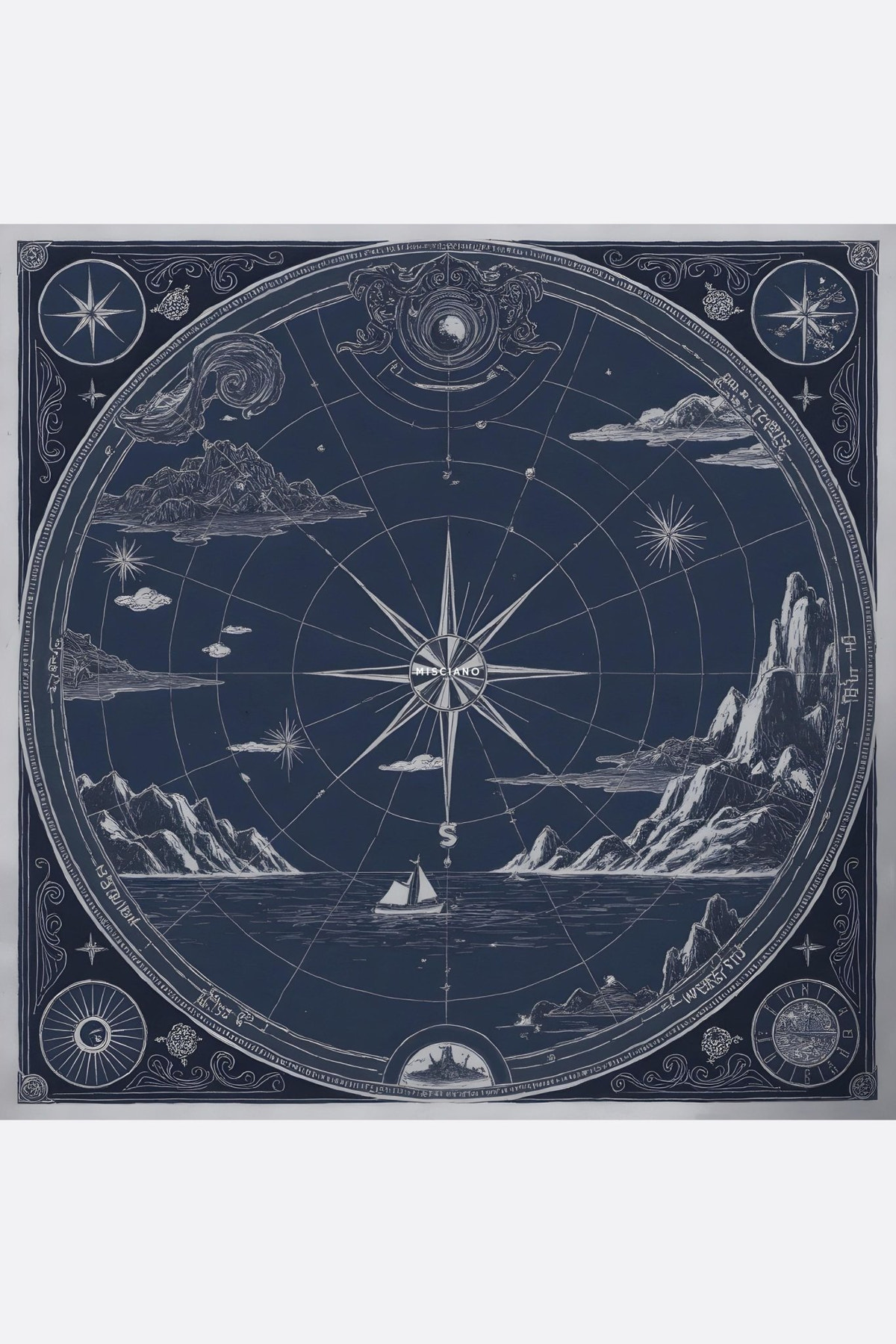 Отправьтесь в воображаемое путешествие с шелковым платком 90x90 см Небесная компас, исключительное произведение, подписанное Мисчиано. Его изысканный узор одновременно вызывает воспоминания о старинных картах и небесных созвездиях, между таинственными горами, успокаивающими морями и звездными ветрами, для поэтичного и вне времени аксессуара.