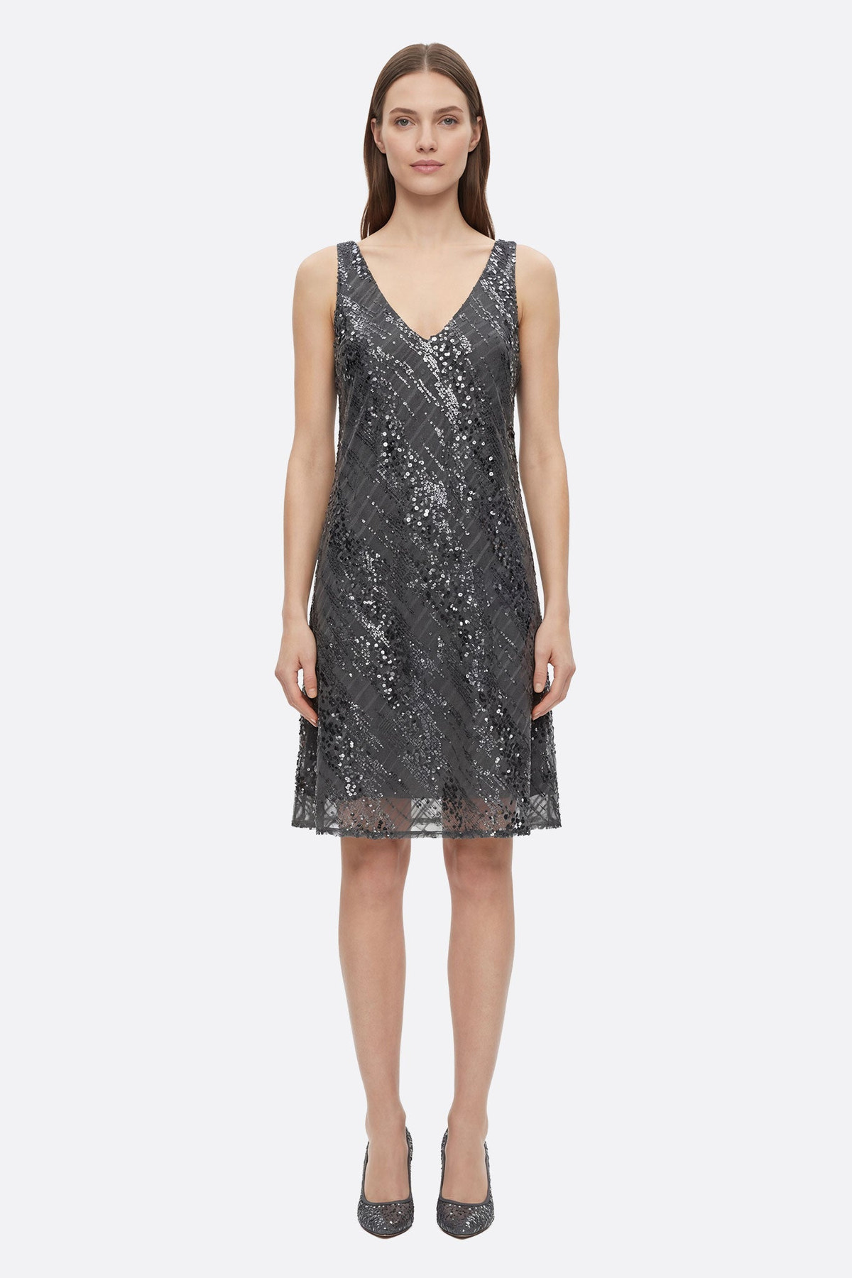 Блестящее платье, созданное для того, чтобы деликатно раскрывать свет, где изысканность отделки встречается с плавностью мягкого и элегантного материала. Создание, которое празднует женственность с блеском.